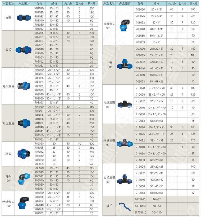 優(yōu)質(zhì)的PE管件、鎖緊式管件和對夾式鞍座是專為鏈接聚乙烯管而設(shè)計的,管徑范圍20-110毫米,可用于連接LDPE、HDPE、PVC等材質(zhì)的管路,符合EN12201、ISO4427、ISO14236、ISO13460、DIN8074等相關(guān)標(biāo)準(zhǔn)。施工方便,有較強的耐腐蝕性,可廣泛應(yīng)用于農(nóng)業(yè)灌溉管路輸水及飲用水輸水,16-63mm管件最大承壓1.6MPa,75-110mm管件最大承壓1.0MPa。